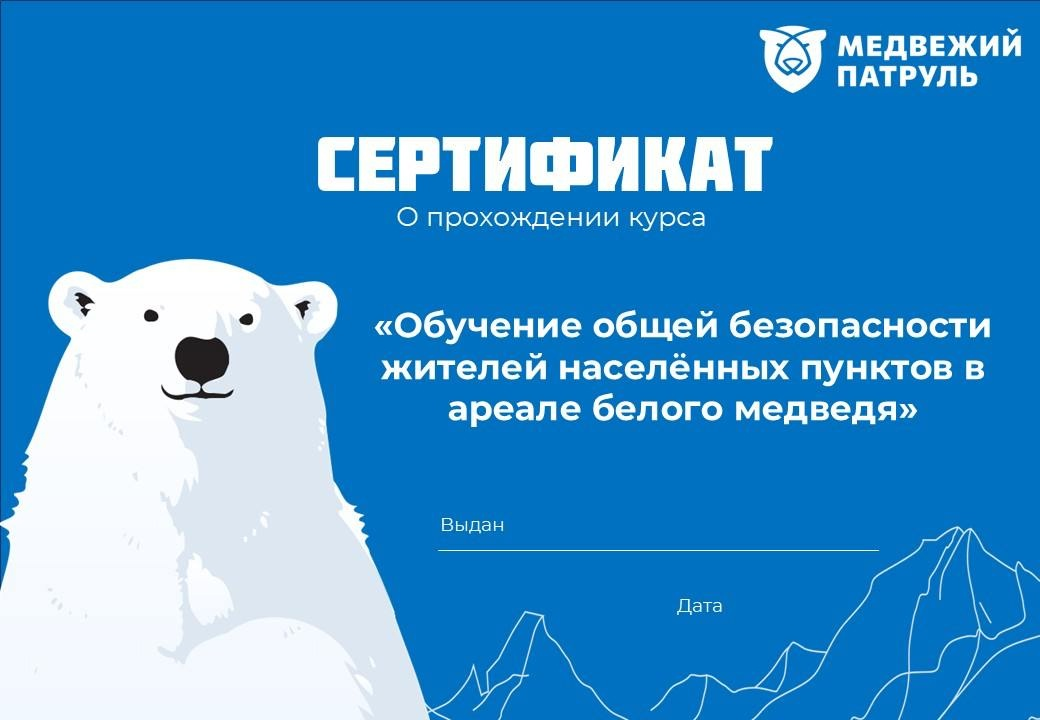 Специальный бесплатный курс размещен на сайте проекта «Медвежий патруль», его можно пройти онлайн. Он рассказывает об основах безопасности в ареале белого медведя. Курс состоит из девяти занятий. Общие сведения о белом медведе, среде его обитания и особенностях поведения, основные правила поведения при обнаружении белого медведя, способы избежания конфликтных ситуаций, использование средств защиты и отпугивания, действия в экстренных случаях.